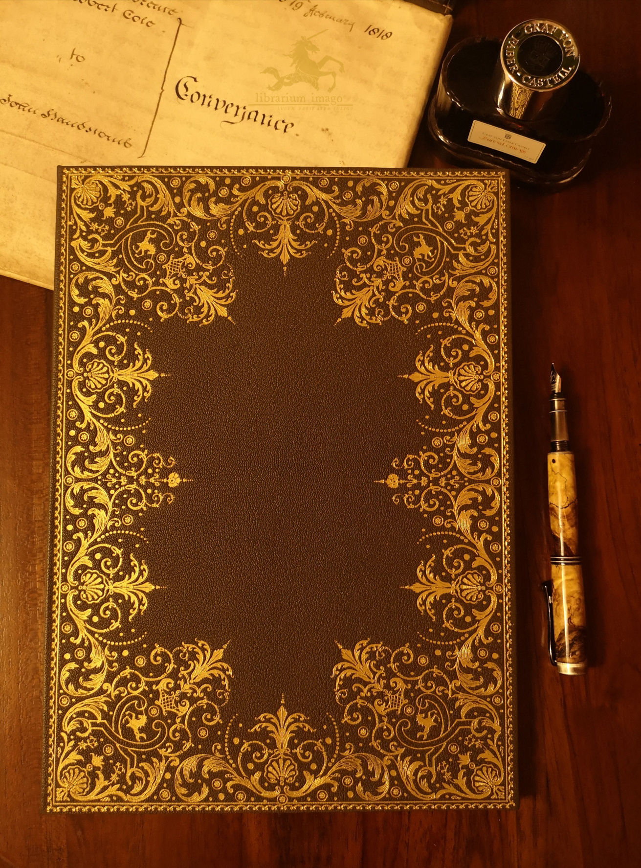 Teczka skórzana, z safianu czyli najtrwalszej skóry o najgrubszym licu, tłoczona i złocona.